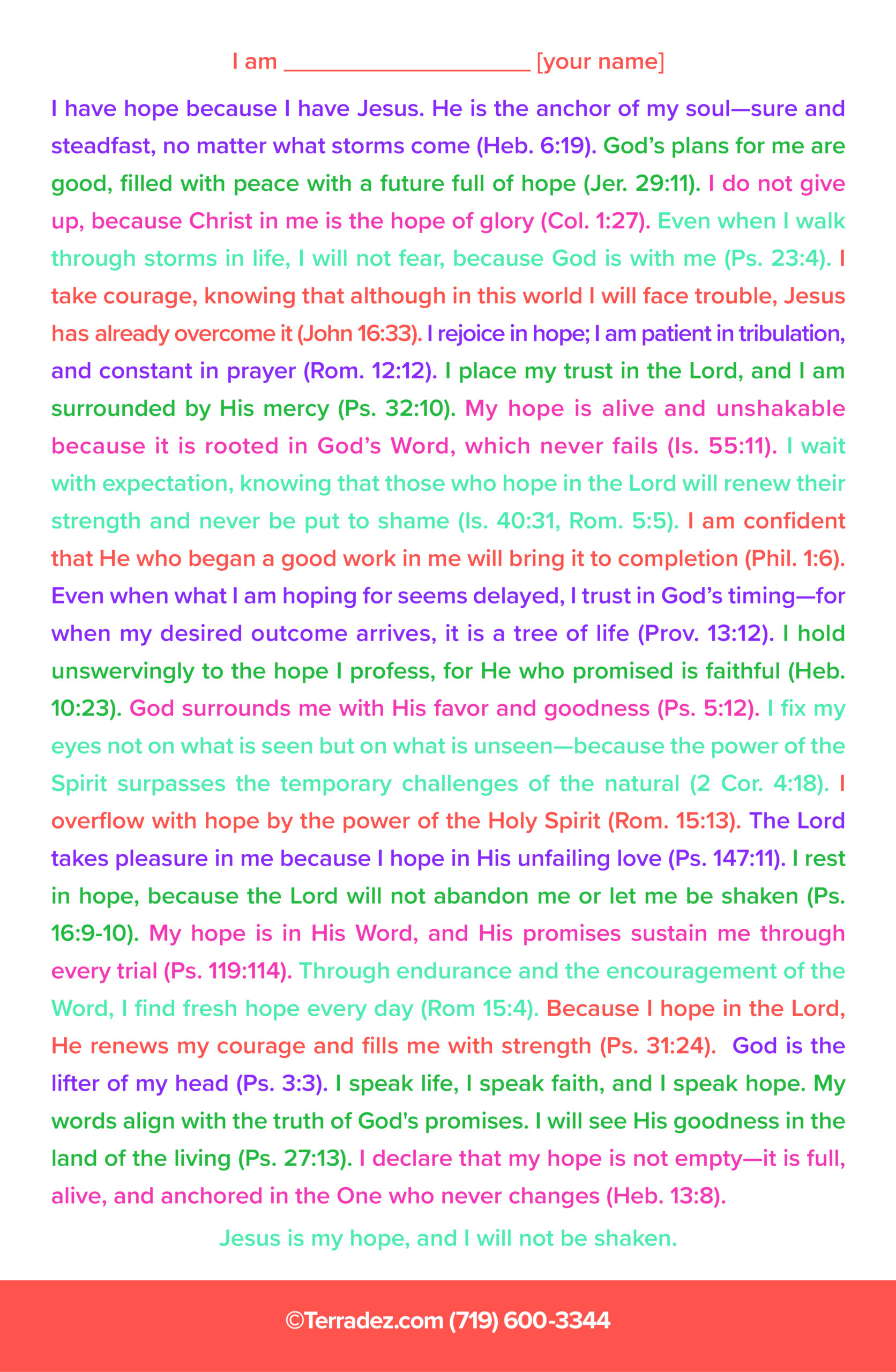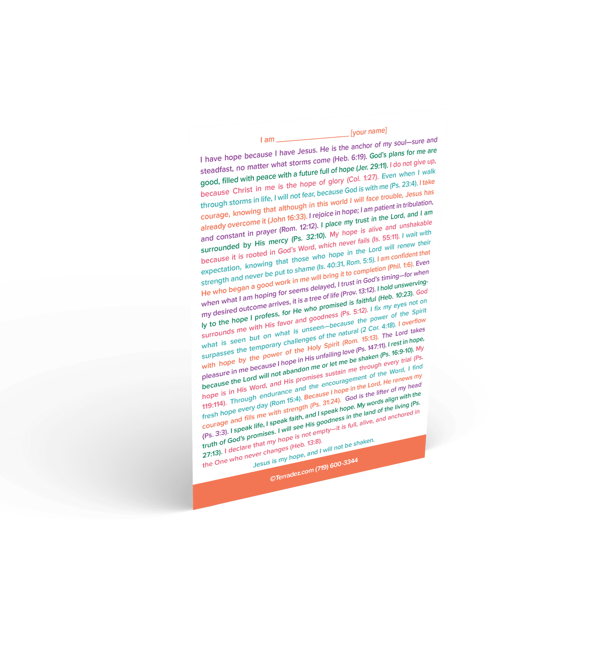 Perfect for your prayer corner, desk, mirror, or Bible journal, the Hope Confession Card keeps God’s promises front and center—right where they belong.
